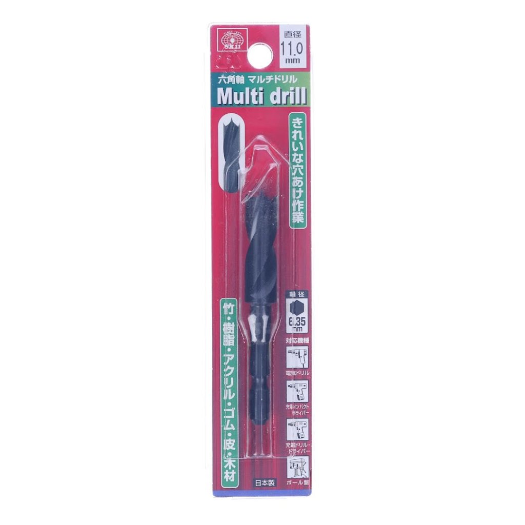 Az SK11 többcélú fúrószár sokoldalú eszköz, amely képes 11,0 mm-es lyukak létrehozására különféle anyagokban, beleértve a fát, bambuszt, gyantát, akrilt, kemény gumit és bőrt. A hatszögletű szár kialakítása lehetővé teszi a gyors, egyérintéses csatlakoztatást, biztosítva a kompatibilitást elektromos fúrókkal, tölthető ütvefúrókkal és fúrógépekkel. Japánban készült. 6,35 mm-es hatszög befogással rendelkezik és optimalizáltan használható legfeljebb 3000 RPM sebességnél.
